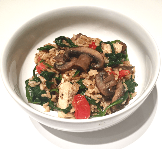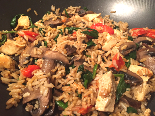 - When the mushrooms are mostly cooked (about 5 minutes), add the spinach and tomatoes to the pan/wok. Season with salt and pepper.